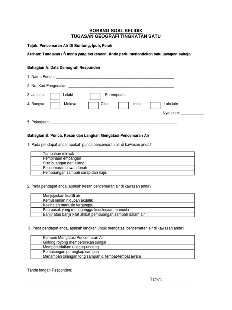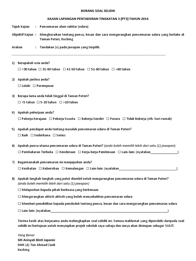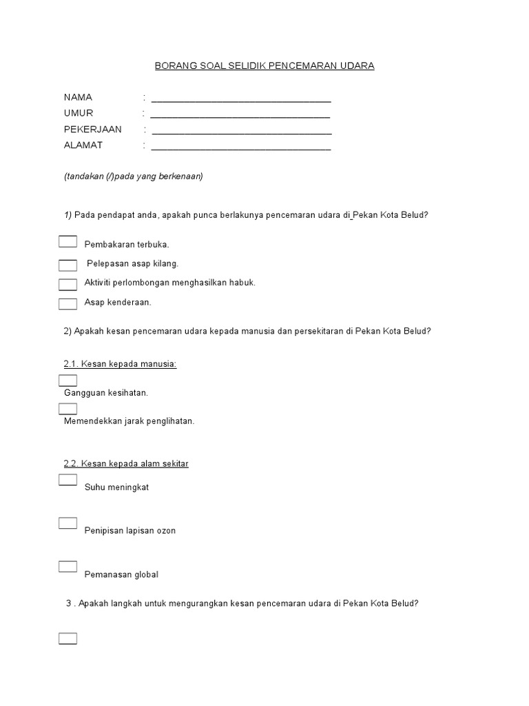 Borang Soal Selidik Pencemaran Udara : Dampak pencemaran udara pun menyebabkan banyak kerugian.. We are a sharing community. Kaedah kajian yang digunakan dalam tugasan ini adalah borang soal selidik. Borang soal selidik for friend. Jika anda mencari contoh borang soal selidik dakwah maka anda berada di tempat yang tepat. Borang temubual soalan kajian guna tanah.