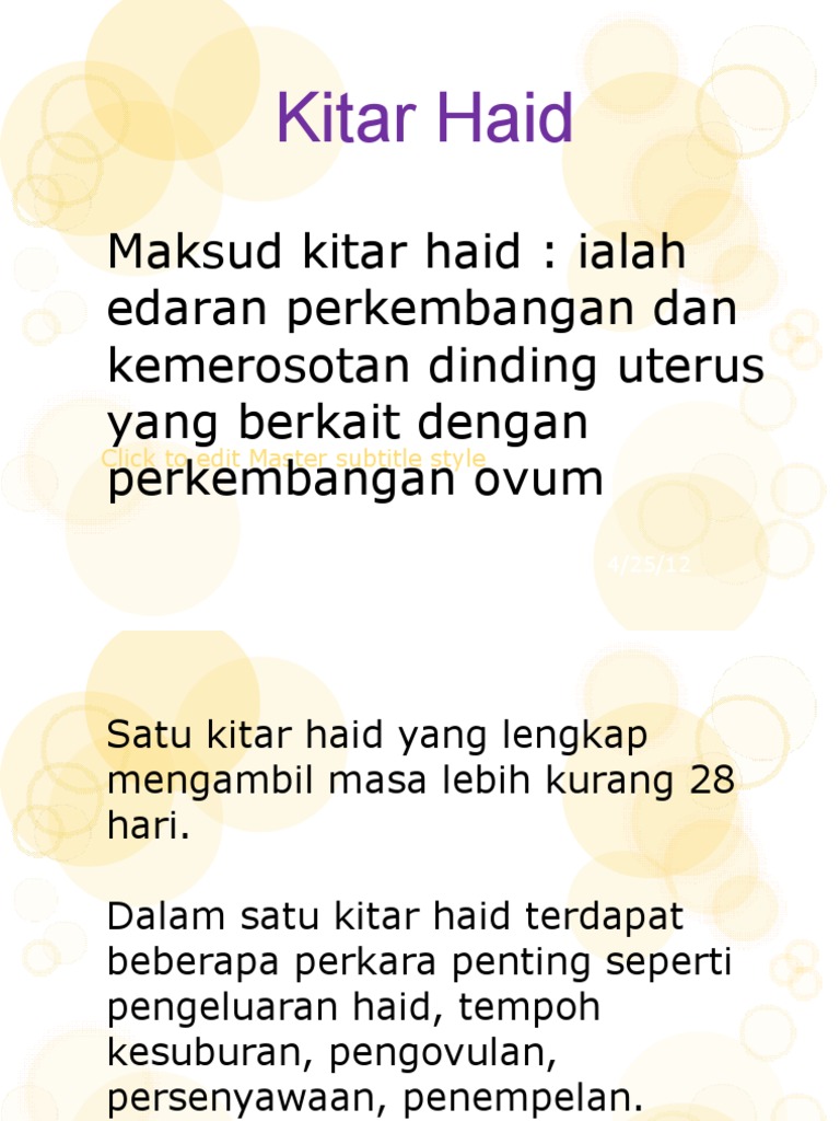 Bagi kebanyakan wanita, tempoh masa antara ovulasi (apabila sebiji telur dibebaskan dari. Untuk menentukan sama ada haid anda teratur atau tidak, kira dari hari pertama haid. Namun, ada beberapa yang mengalami kitaran yang tidak teratur, misalnya kurang dari 21 hari atau lebih dari 35 hari. Apabila sudah ada 3 kitaran haid yang anda dapat, kira puratanya (lihat gambarajah). Namun, siklus ini tidak sama untuk setiap wanita. Banyak punca berlaku keadaan seperti ini. Idealnya, haid terjadi setiap 28 hari sekali. Periode normal dapat berlangsung antara dua hingga tujuh hari. Normalnya, menstruasi datang tiap 21 hingga 35 hari sekali. Dalam kebanyakan kes, darah haid coklat adalah normal. Kitaran boleh jadi sependek 22 hari atau selama 36 hari. Puan boleh emailkan ke drzubaidiahmad@gmail.com Kehilangan darah secara keseluruhan dalam jangka masa adalah sekitar 2 hingga 3 sudu besar tetapi rembesan cecair lain dapat membuatnya kelihatan lebih banyak.
